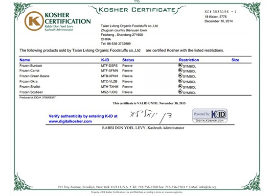 日前,泰安绿龙有机食品有限公司顺利通过欧美“KOSHER”认证。 2014年11月9日至10日,“KOSHER”认证机构审核人员参观了泰安绿龙公司的生产现场,并对公司的质量和环境管理体系进行了严格的考察、评估,12月10日,绿龙公司取得“KOSHER”认证证书!